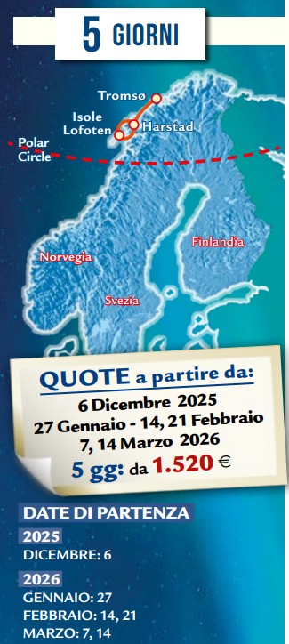 Nota: l’escursione facoltativa per la caccia alle Aurore in bus con guida è facoltativa e si effettua solo con un minimo di 10 partecipanti per ogni sera.